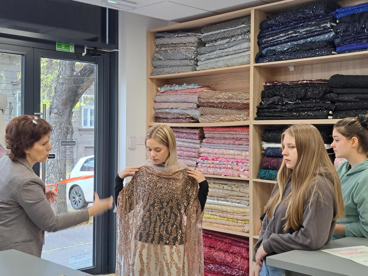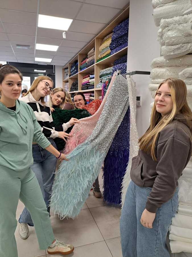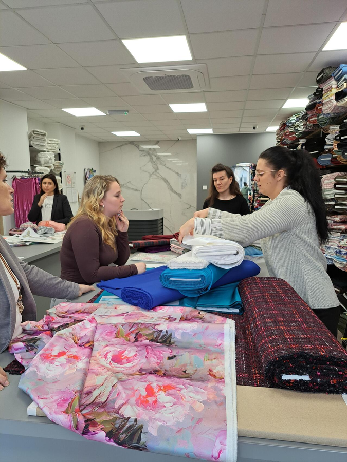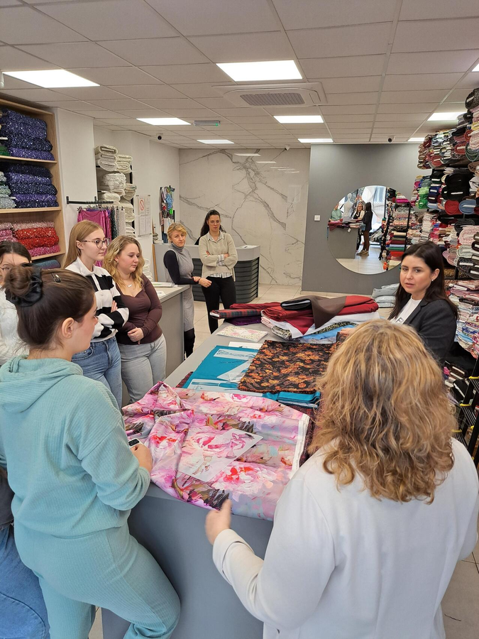 Az IV–15 osztály tanulói (ruhamodellező technikus oktatási profil) Ana Žigmanov Vuković és Kata Suknović tanárnők kíséretében november 17-én, hétfőn ellátogattak a szabadkai La Fira Tekstil üzletbe, ahol exkluzív textilipari alapanyagok kaphatók. A látogatás során, a kellemes légkörnek és a La Fira csapata kedvességének köszönhetően a tanulók kapcsolatot tudtak teremteni szinte valamennyi szakmai tantárgy tananyaga között. Az inspirációt az alkalmi ruha adta – ennek mentén szinte „összeszőtték” a szakmai ismereteket a tervezéstől kezdve a textilanyagok kiválasztásán át egészen a bemutatott anyagok szabásáig és varrásáig. A tanulók gyakorlati módon bővíthették tudásukat, miközben megismerkedtek az újabb anyagtípusokkal és azok piaci elnevezéseivel is: a nyomott brokátoktól a kézzel felvarrt üveggyöngyökkel díszített kelméken át egészen azokig az anyagokig, amelyek szélességük mentén eltérő textúrájúak – flitteres felülettől a tollas díszítésig. „Magunkkal vittük a ruhatervezés órákon készült rajzokat, és közösen javasoltunk megfelelő anyagokat az egyes modellekhez” – magyarázta Kata Suknović tanárnő.