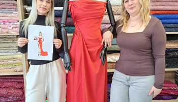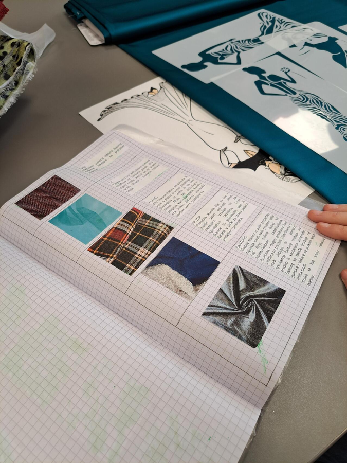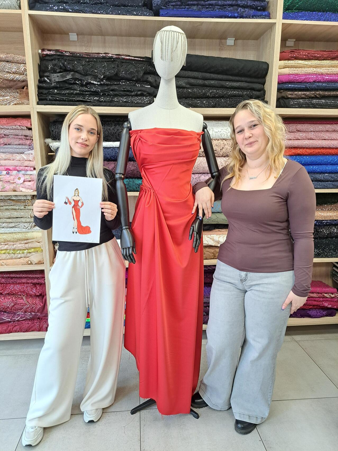 Ana Ćakić és Kristina Pap tanulók egy ruhaterv (Ana Ćakić munkája) alapján, az anyagok összeillesztésével formálták meg a ruha alakját a rajznak megfelelően. „Mivel végzős diákokról van szó, az alkalmi ruha témája különösen aktuális – legyen szó akár a 18. születésnap megünnepléséről, akár a közelgő ballagásról, arról a napról, amikor iskolánk ragyog a végigvonuló diákok pompás ballagási ruháitól” – tette hozzá Suknović tanárnő. Elismerően szólt az üzlet kedves munkatársairól is, külön kiemelve egykori tanítványát – akinek osztályfőnöke is volt –, aki nagy szakértelemmel mutatta be a tanulóknak az elérhető anyagokat, és hangsúlyozta, mennyire fontos a megfelelő anyag kiválasztása és összehangolása az adott szabásmintával.