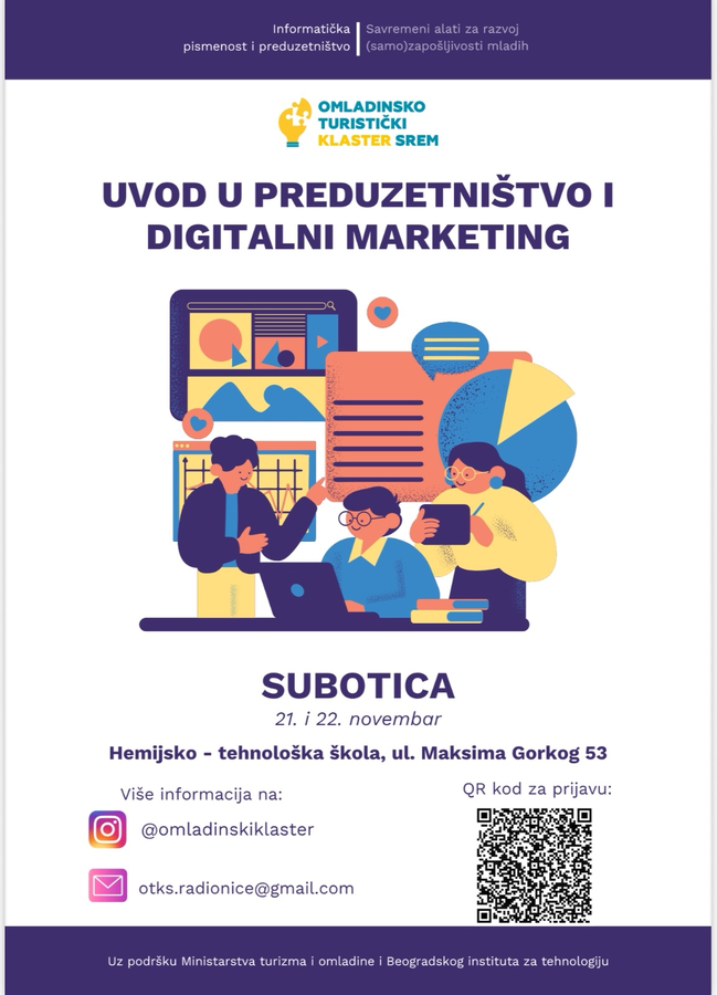 Az Informatikai írástudás és vállalkozás – korszerű eszközök a fiatalok (ön)foglalkoztathatóságának fejlesztéséhez című műhelyfoglalkozásokat idén ismét megrendezik Szabadkán, november 21-én és 22-én. A két műhely (ChatGPT és MI, valamint Digitális marketing és vállalkozás) párhuzamosan zajlik november 21-én 18 és 20 óra között, illetve november 22-én 10 és 16 óra között. A foglalkozások ingyenesek, és minden 15 és 30 év közötti érdeklődő számára elérhetők, a résztvevők pedig tanúsítványt kapnak.