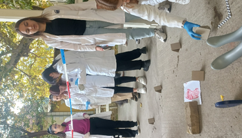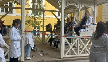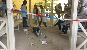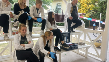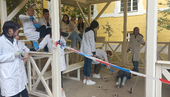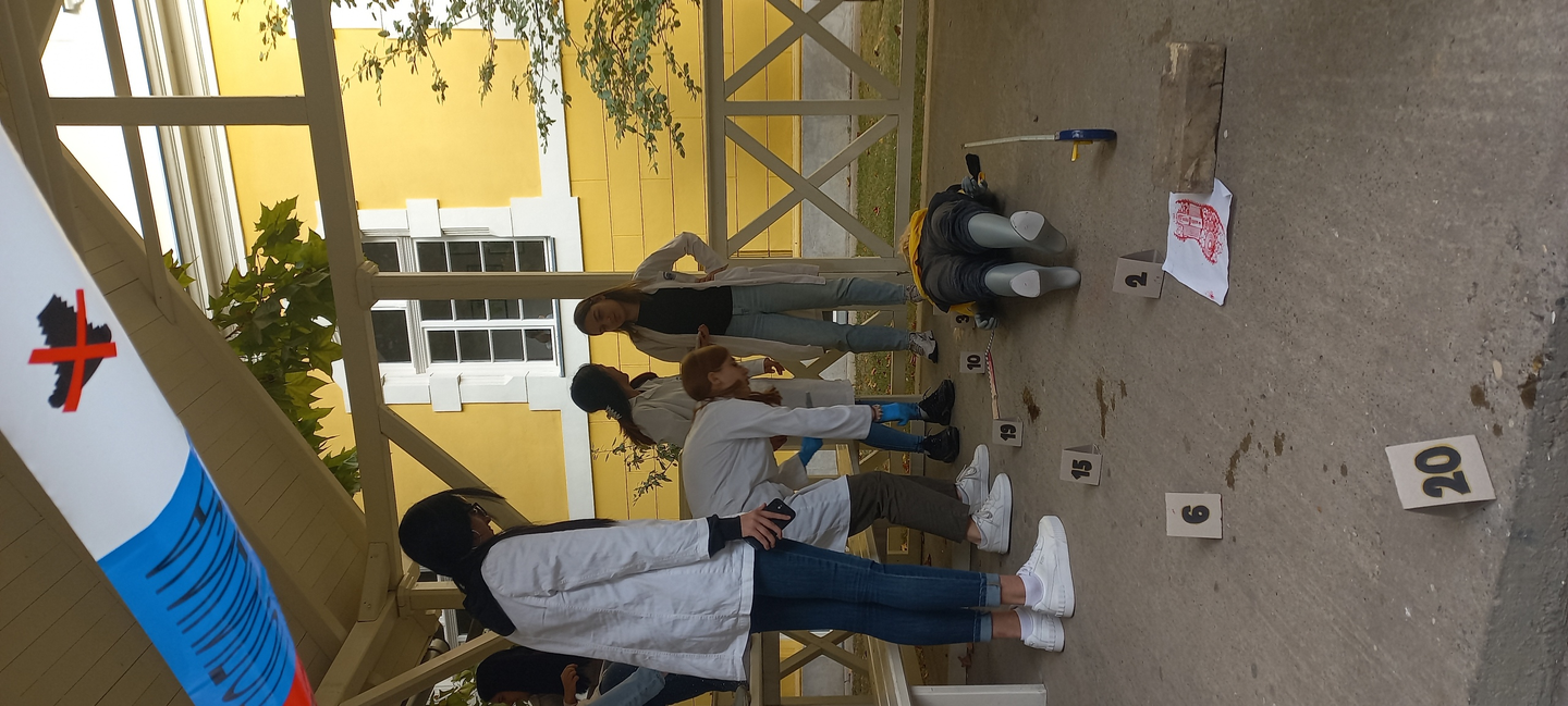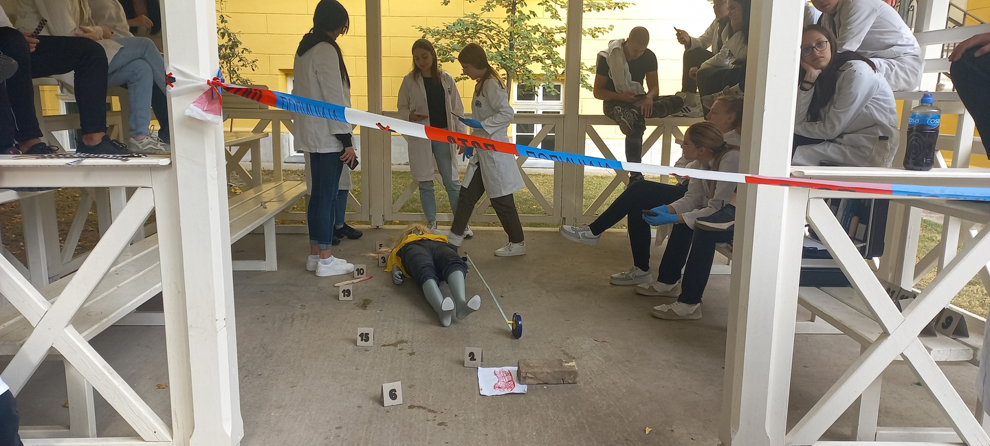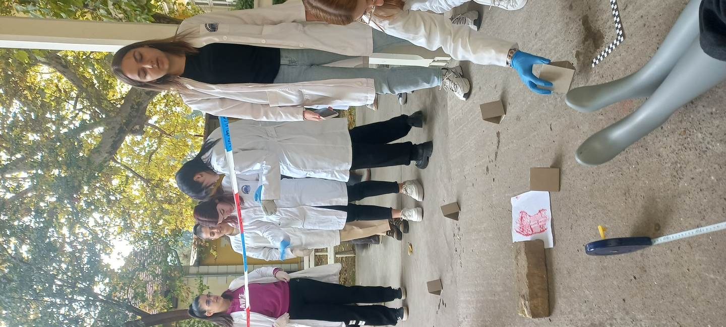 Az októberi jó idő lehetővé tette a IV–8 és IV–9 osztály tanulóinak, hogy gyakorlati óráikat az iskola udvarában lévő nyári tanteremben tartsák, amelyet az oktatás céljaira bűnügyi helyszínné alakítottak, egy próbabábut használva „áldozatként”…