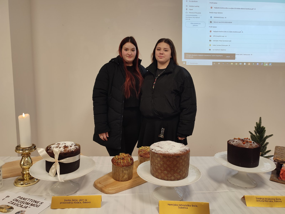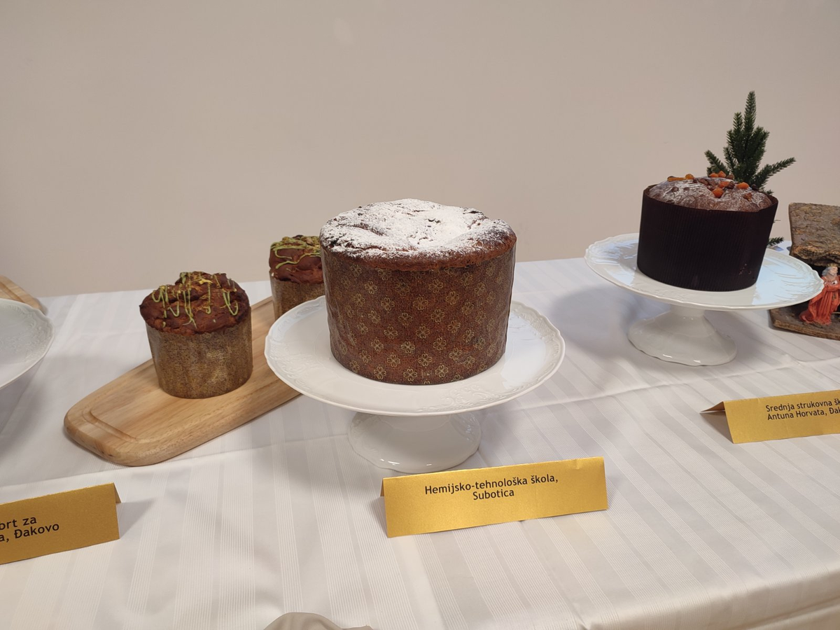 A Vegyészeti–Technológiai Iskola tanulói a diakovári (Đakovo) Antun Horvat Szakközépiskola vendégei voltak, miután meghívást kaptak az Adventi vásárra, amelyet december 17-én rendeztek meg „Panettone – szülőföldem ízeivel” elnevezéssel. „Nagy kihívást jelentett számunkra ez a feladat. Az olasz eredetű édes kenyér elkészítése hosszadalmas folyamat, sok türelmet igényel, ugyanakkor minden, közös munkával töltött perc megérte, hiszen rengeteget tanultunk a hagyományos elkészítési módokról” – mondta B. Varga Teodóra tanárnő. A sütemények bemutatását követően a tanulók és a pedagógusok megkóstolhatták a kiállított finomságokat, majd kötetlen beszélgetés keretében tapasztalatot cseréltek azok készítéséről. „Az az öröm, amit a látogatók mosolyát látva átéltünk, szavakkal leírhatatlan” – tette hozzá B. Varga tanárnő. Iskolánkat Anabela Stantić, Adrijana Ivković Ivandekić és Dejan Bazler tanulók képviselték a II–7 osztályból, mentoruk Mirjana Dulić tanárnő volt.