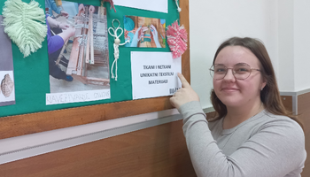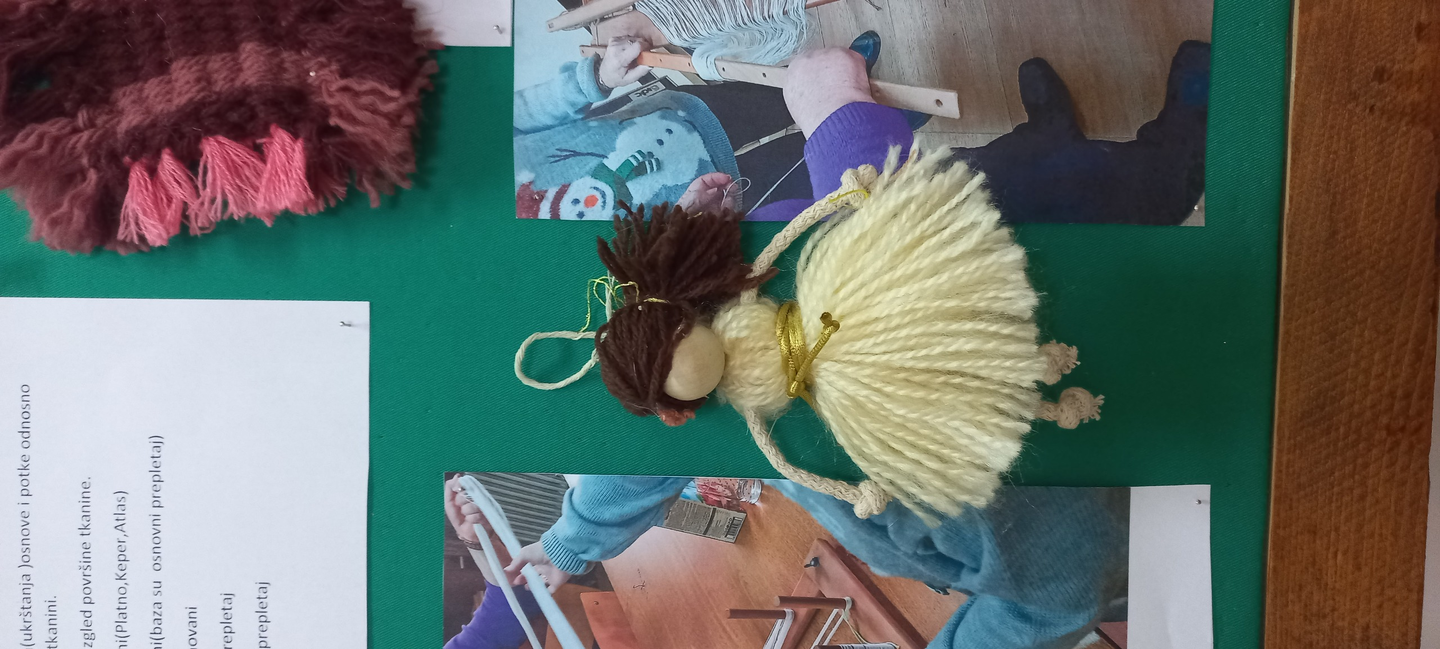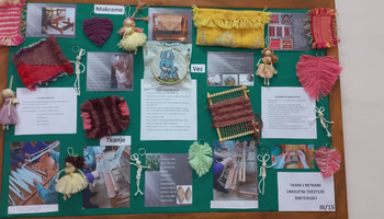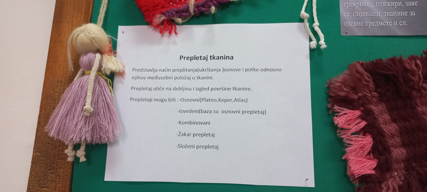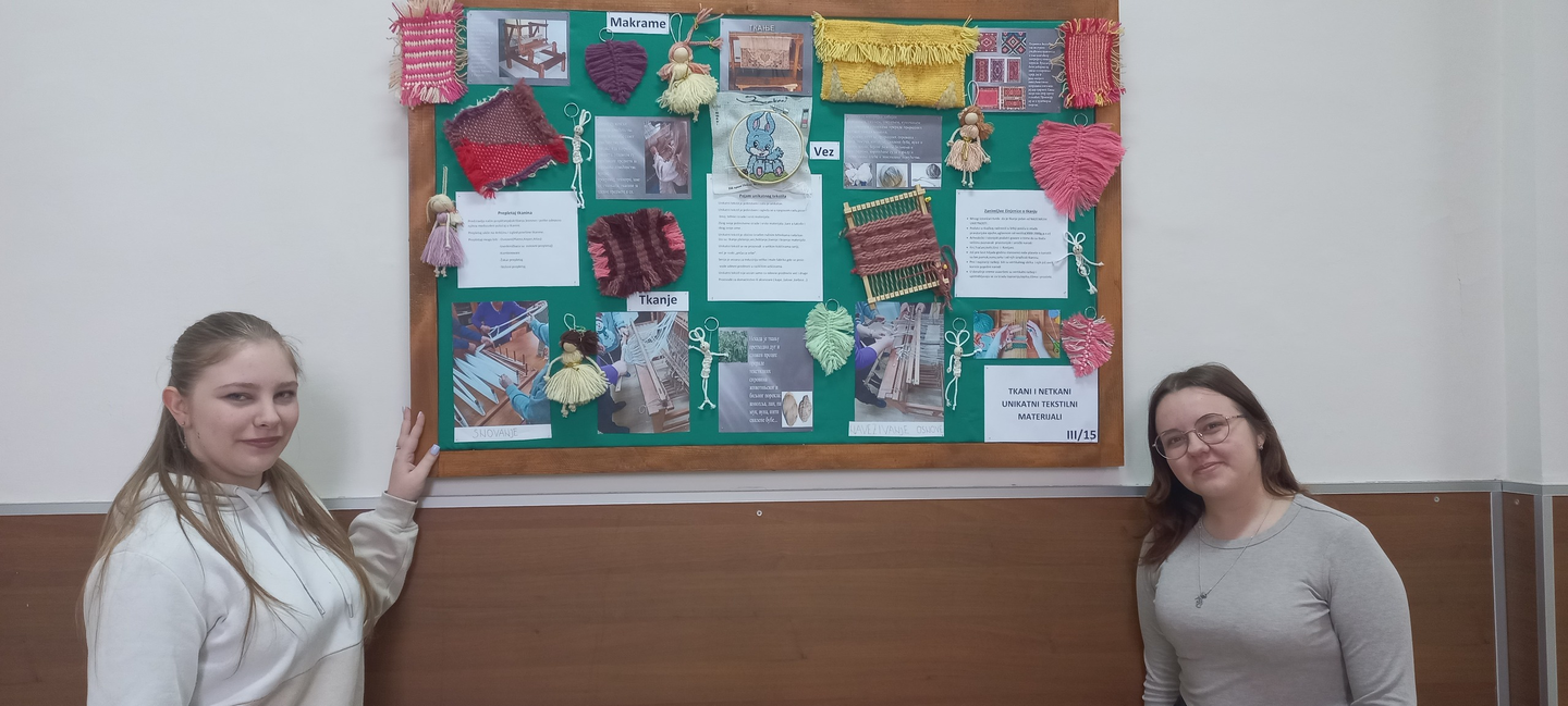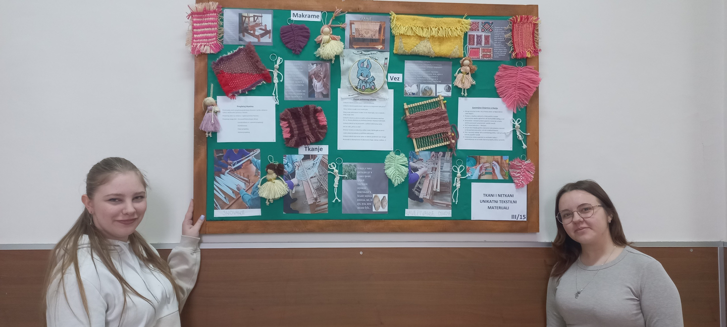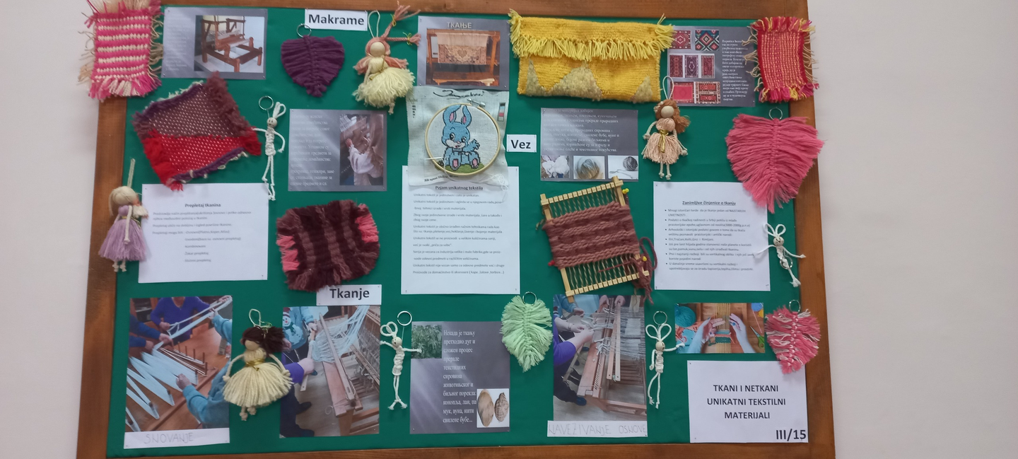 A szőtt és kötött egyedi textíliák órán a III-15 osztály tanulói (leendő ruhamodellező technikusok) megismerkedtek a kötés és hímzés alapjaival. Jelena Muminović tanárnő segített nekünk megtanulni a kötés minden "trükkjét", és elsajátítani valamit, amit eddig sosem próbáltunk! A munka eredménye egy faliújság lett, amely az iskola első emeletén (a könyvtár mellett) található, és amelynek elkészítése igen nagy kihívást jelentett – érintenünk kellett mindent, ami a kötéshez kapcsolódik, az elkészített munkákat el kellett helyeznünk a faliújságon, s mindezt kreatívan!