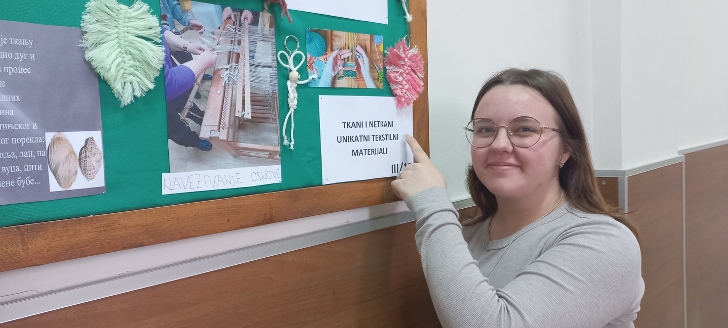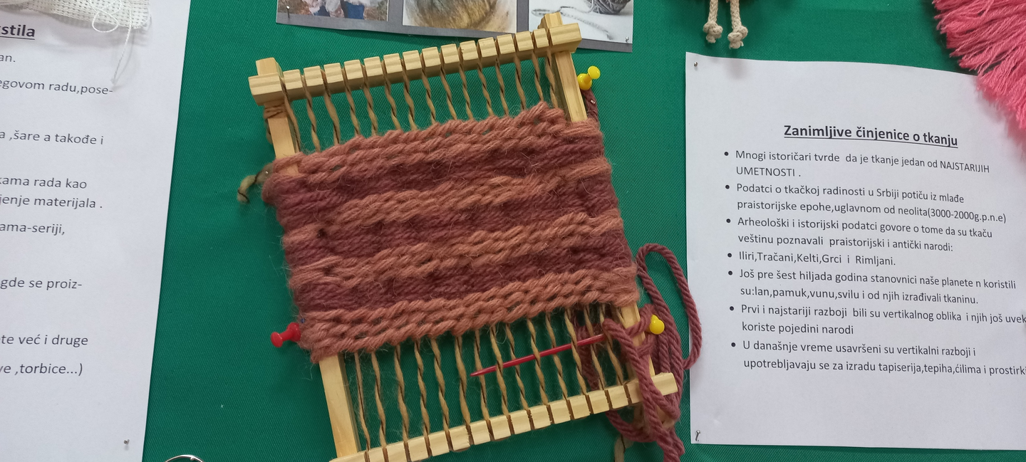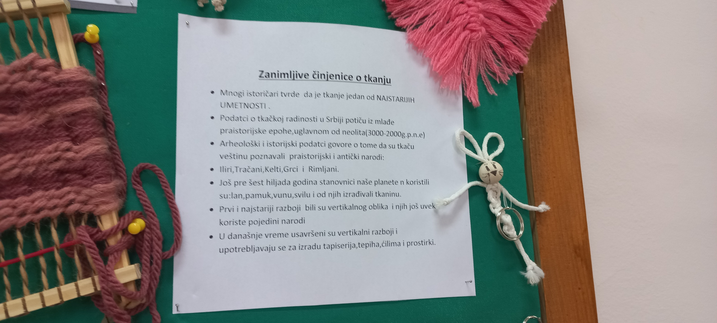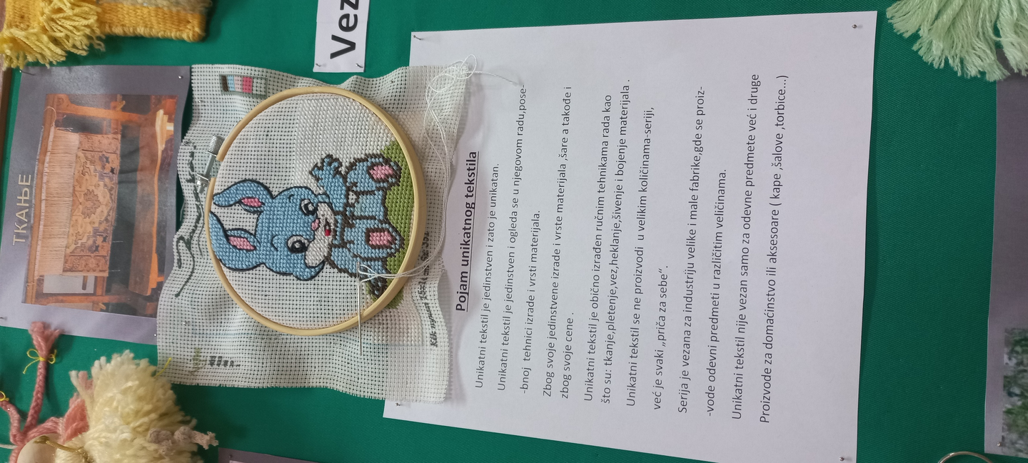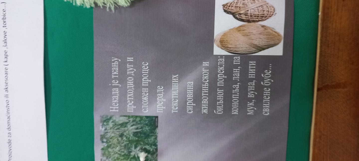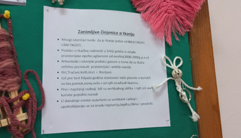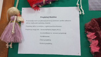 A szőtt és kötött egyedi textíliák órán a III-15 osztály tanulói (leendő ruhamodellező technikusok) megismerkedtek a kötés és hímzés alapjaival. Jelena Muminović tanárnő segített nekünk megtanulni a kötés minden "trükkjét", és elsajátítani valamit, amit eddig sosem próbáltunk! A munka eredménye egy faliújság lett, amely az iskola első emeletén (a könyvtár mellett) található, és amelynek elkészítése igen nagy kihívást jelentett – érintenünk kellett mindent, ami a kötéshez kapcsolódik, az elkészített munkákat el kellett helyeznünk a faliújságon, s mindezt kreatívan!