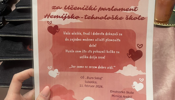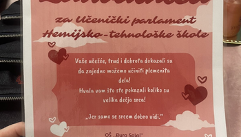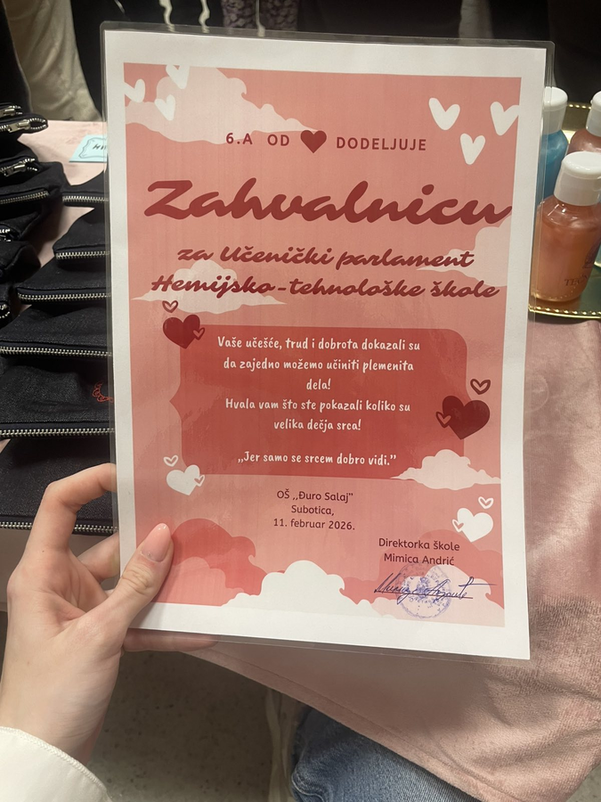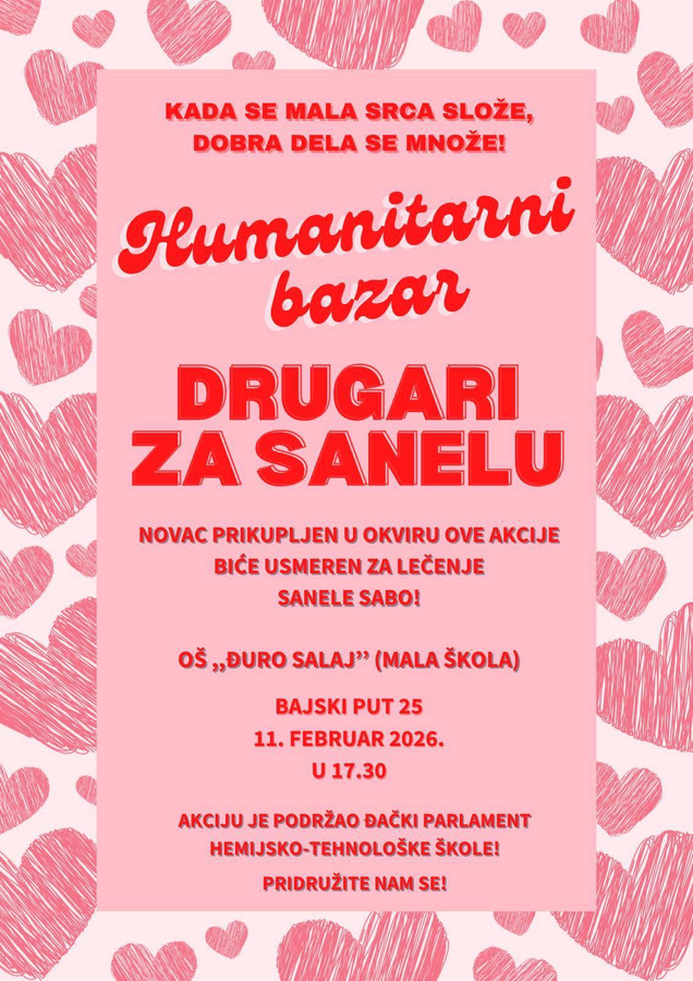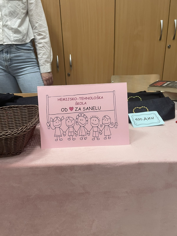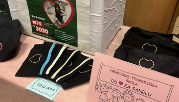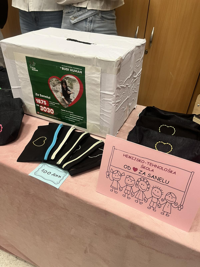 Učenički parlament Hemijsko-tehnološke škole podržao je akciju “Humanitarni bazar”, održanu u sredu, 11. februara, u OŠ “Đuro Salaj”, čiji je cilj prikupljanje sredstava za učenicu ove škole Sanelu Sabo. Naše učenice: Iva Katančić, Nađa Antunović i Marijana Ćirić “prodavale” su proizvode Hemijsko-tehnološke škole (bočice tečnog sapuna, peronice i obeleživače za knjige) – posetioci su ostavljali dobrovoljni prilog, a sve u skladu sa sloganom akcije: “Kad se mala srca slože, dobra dela se množe!”. “Bazar je bio posećen, ljudi spremni da pomognu, a posebno dirljiv momenat bio je onaj kada su nam prišle mama i baka Sanele Sabo i pred svima nam se zahvalile” – ističe Iva Katančić, učenica odeljenja IV-15. Manifestaciji je prisustvovala i Vanja Mihajlović (pedagog Hemijsko-tehnološke škole) koja podseća: “Akcija još uvek traje i ukoliko želite da pomognete, možete da pošaljete SMS poruku 1875 na 3030 za lečenje devojčice”.