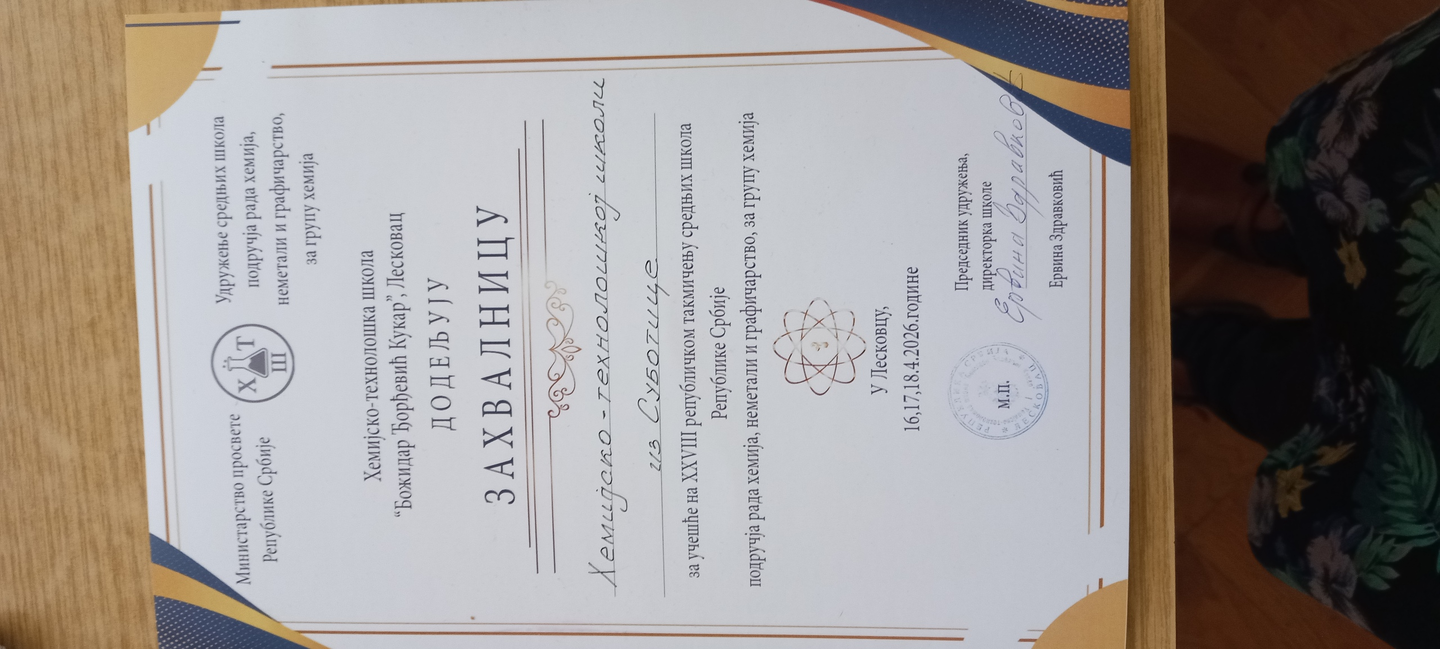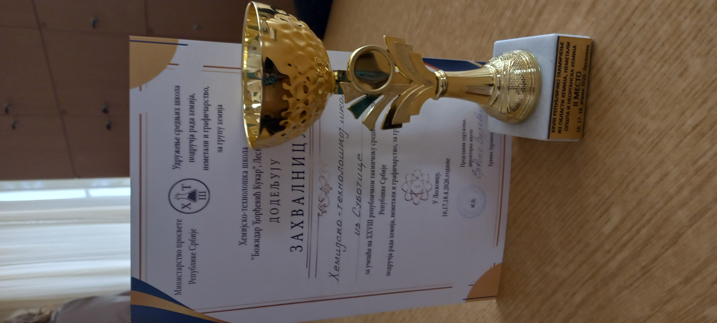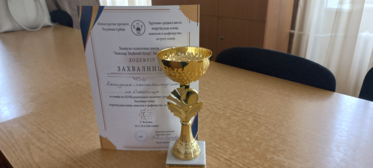 Učenici Hemijsko-tehnološke škole ostvarili su još jedan veliki uspeh (u nizu), ovaj put na XXVIII Republičkom takmičenju srednjih škola - područje rada hemija, nemetali i grafičarstvo za grupu hemija (održanom u Leskovcu, od 16. do 18. aprila), zauzevši drugo mesto u ekipnom plasmanu iz opšte i neorganske hemije! Milica Marić (odeljenje 1-13) osvojila je bronzanu medalju, a zapaženo učešće imao je i Nikola Mandić (odeljenje 1-9). Osim učenicima, čestitke idu i njihovim mentorkama, profesorkama Branislavi Galić i Ivani Stanojević koje su mesecima pripremale učenike za ovo prestižno takmičenje.