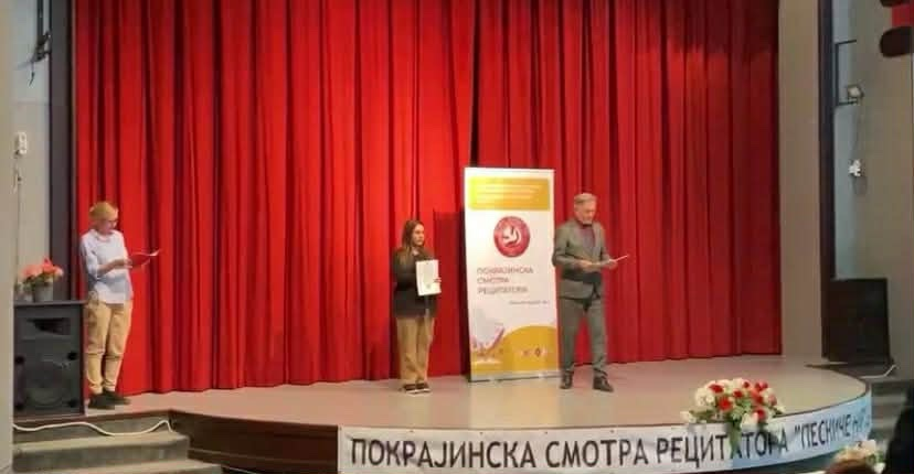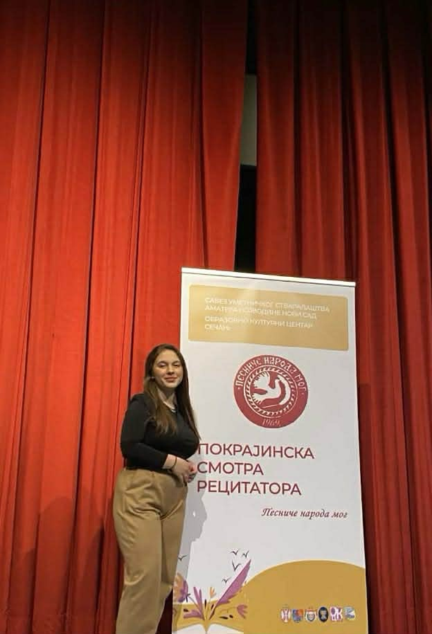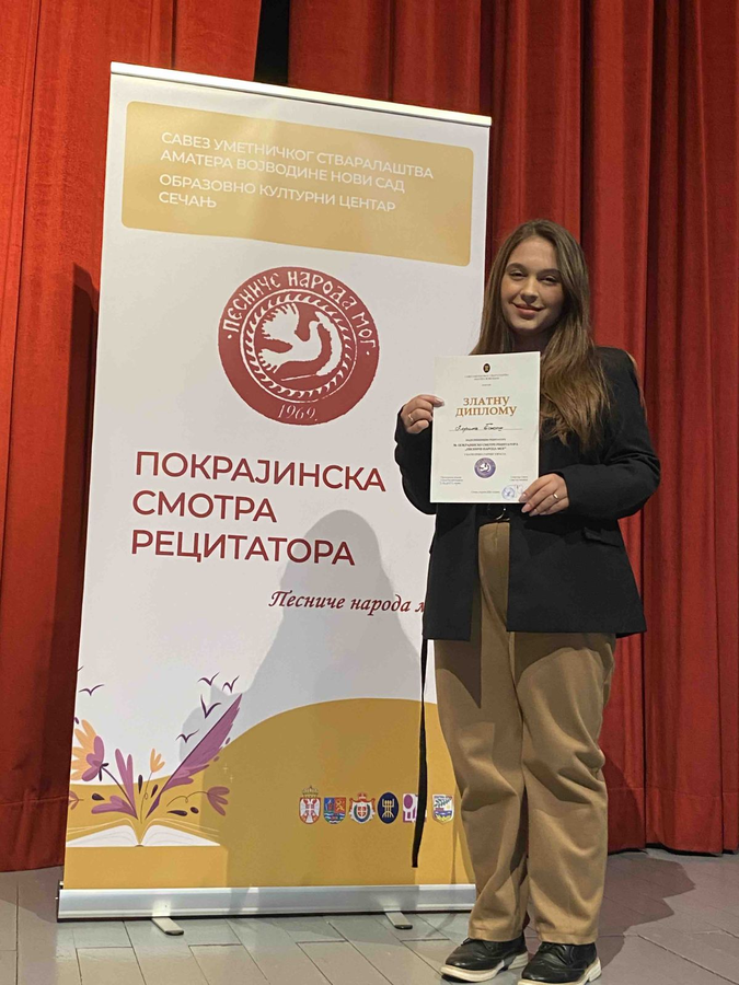 Od 11 recitatora iz Subotice koji su učestvovali na 56. Pokrajinskoj smotri recitatora „Pesniče naroda mog”, održanoj za vikend u Sečnju, njih četvoro osvojilo je zlatne diplome, a među njima i Dorina Bakoš, učenica odeljenja III-8 Hemijsko-tehnološke škole, čiji je mentor profesorka Mercedes Varga. Iako se nije plasirala na republičku smotru recitatora (koja će biti održana sredinom maja u Valjevu), naša učenica ostvarila je veliki uspeh, osvojivši zlatnu diplomu u jakoj konkurenciji (41 takmičar). Talentovana Dorina, koja se recitovanjem bavi od malih nogu (prve nagrade osvajala je još kao učenica osnovne škole), ovaj put opredelila se za poeziju svog omiljenog pesnika Dežea Kostolanjija.